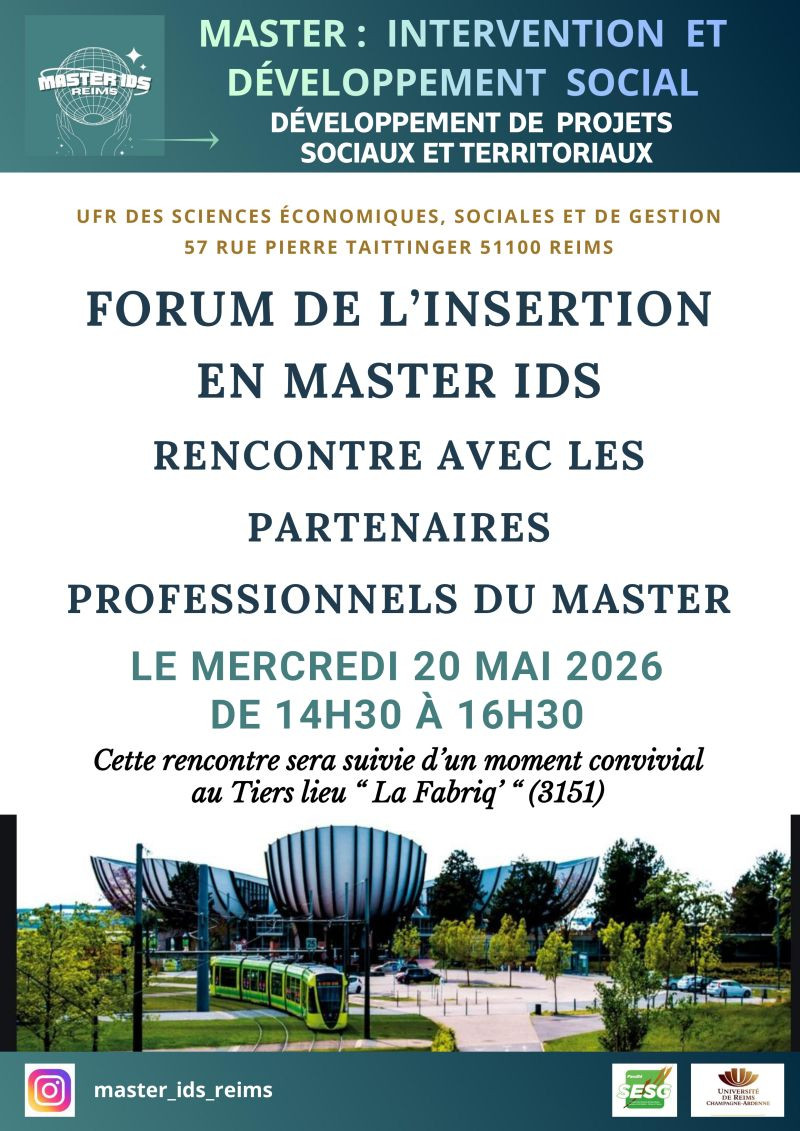 Le Master 1 Intervention et Développement Social organisera un forum de l’insertion professionnelle le mercredi 20 mai 2026 à partir de 13h30, sur le Campus Croix-Rouge à Reims (57 rue Pierre Taittinger, 51100 Reims).